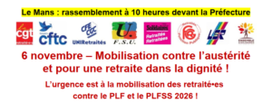 Les retraité.es doivent se révolter, car nous sommes observés attentivement par les gouvernants. La France compte 17 millions de retraités, et La Sarthe 136 000 c’est une force considérable. C’est pour cela que nous comptons sur chacun et chacune d’entre vous pour sensibiliser les retraité.es que vous côtoyez au quotidien pour qu’ils et elles viennent renforcer massivement le mouvement de protestation que porte les Organisations syndicales et associatives de La Sarthe.