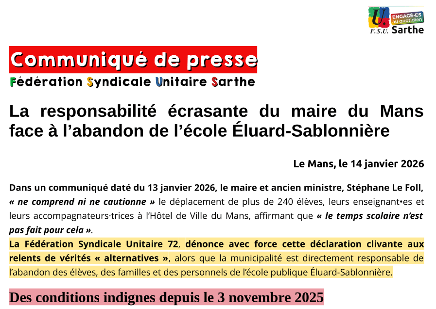 Carte scolaire 2026 en Sarthe : report et conséquences Nouvelles dates La carte scolaire 2026 (ouvertures et fermetures de classes et de postes du 1er degré) est reportée après les élections municipales des 15 et 22 mars 2026. Les nouvelles dates des instances sont : CSA-SD 1er degré : 31 mars (matin) et 7 avril (matin) CDEN : dates à confirmer avec la Préfecture et le Conseil Départemental Pourquoi [...]