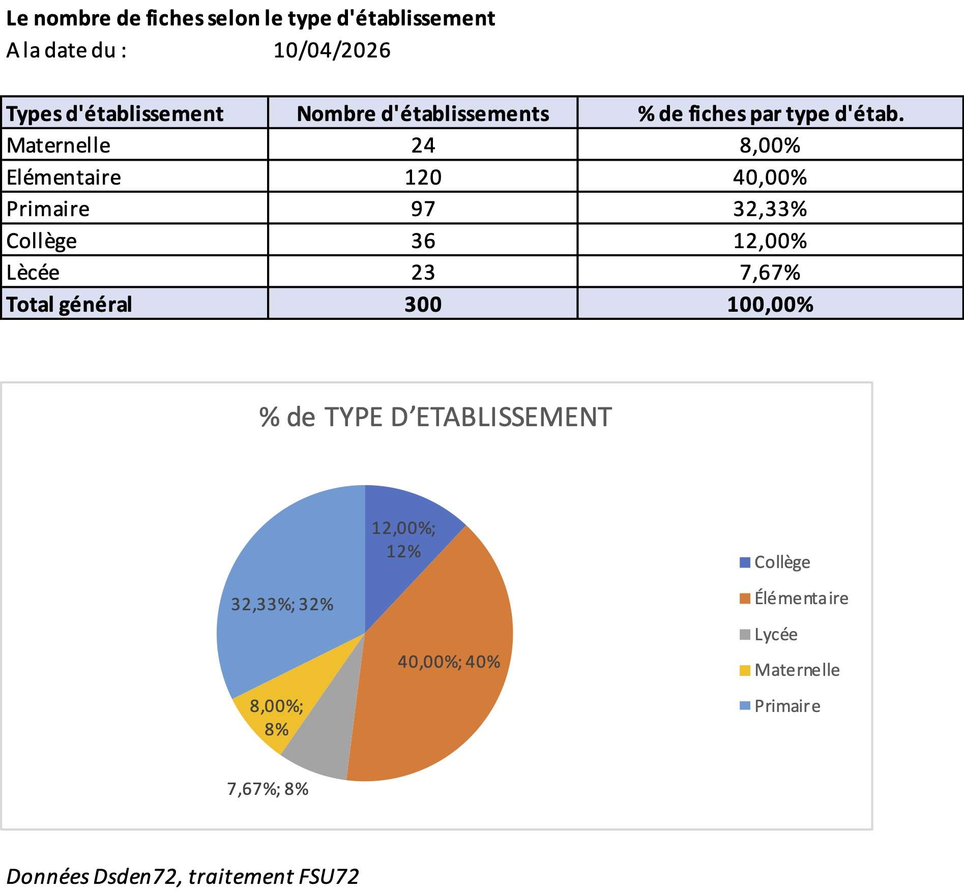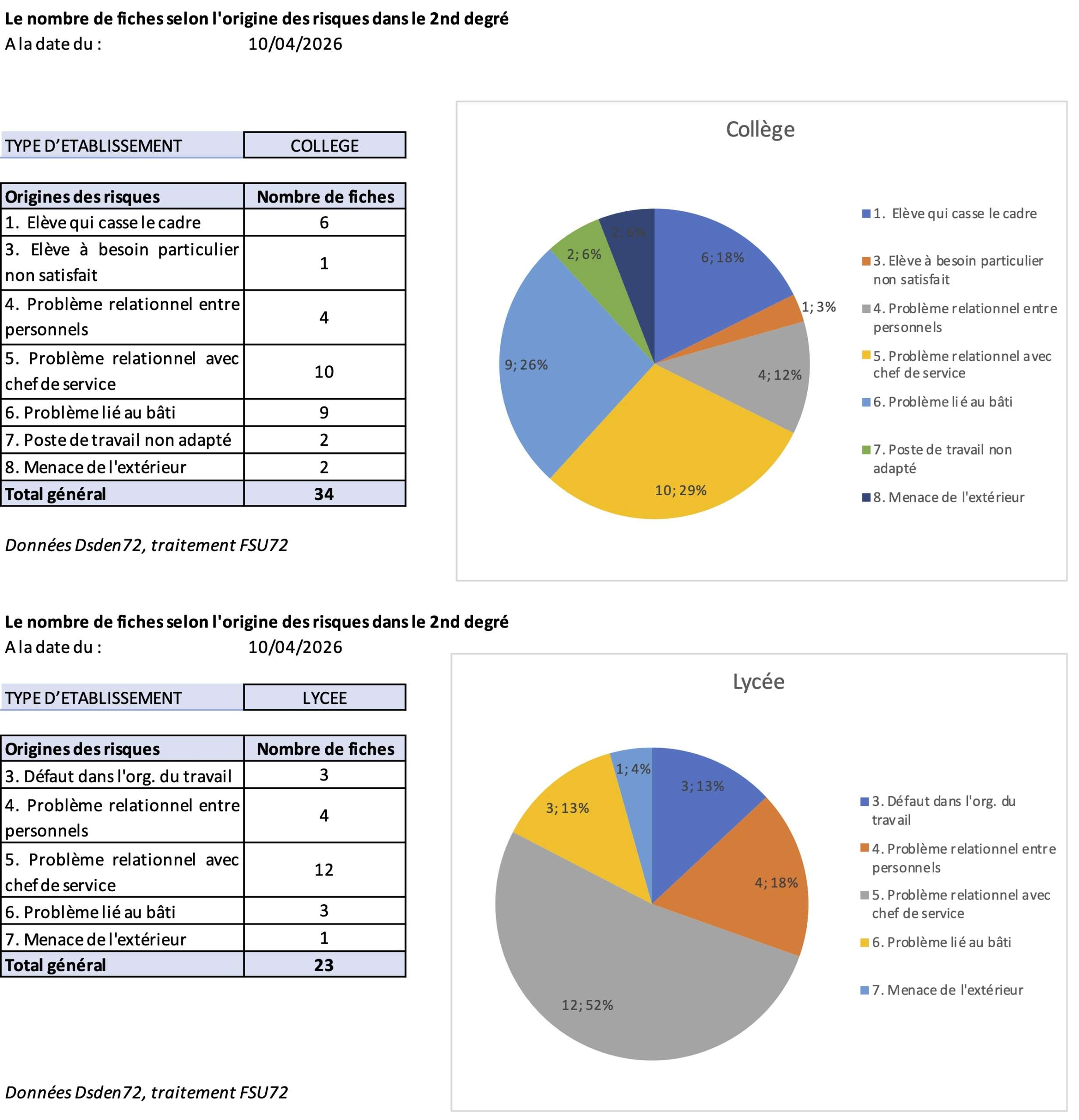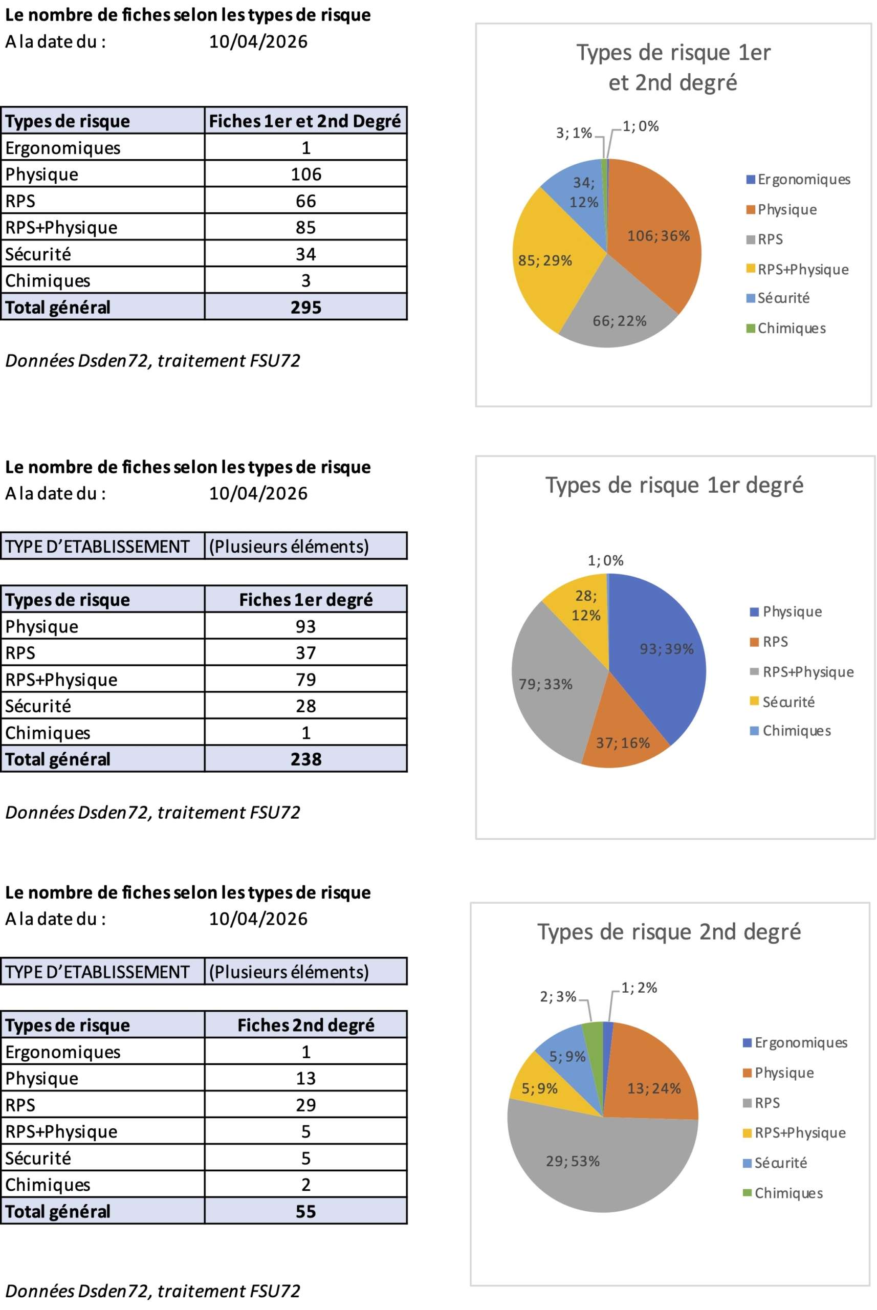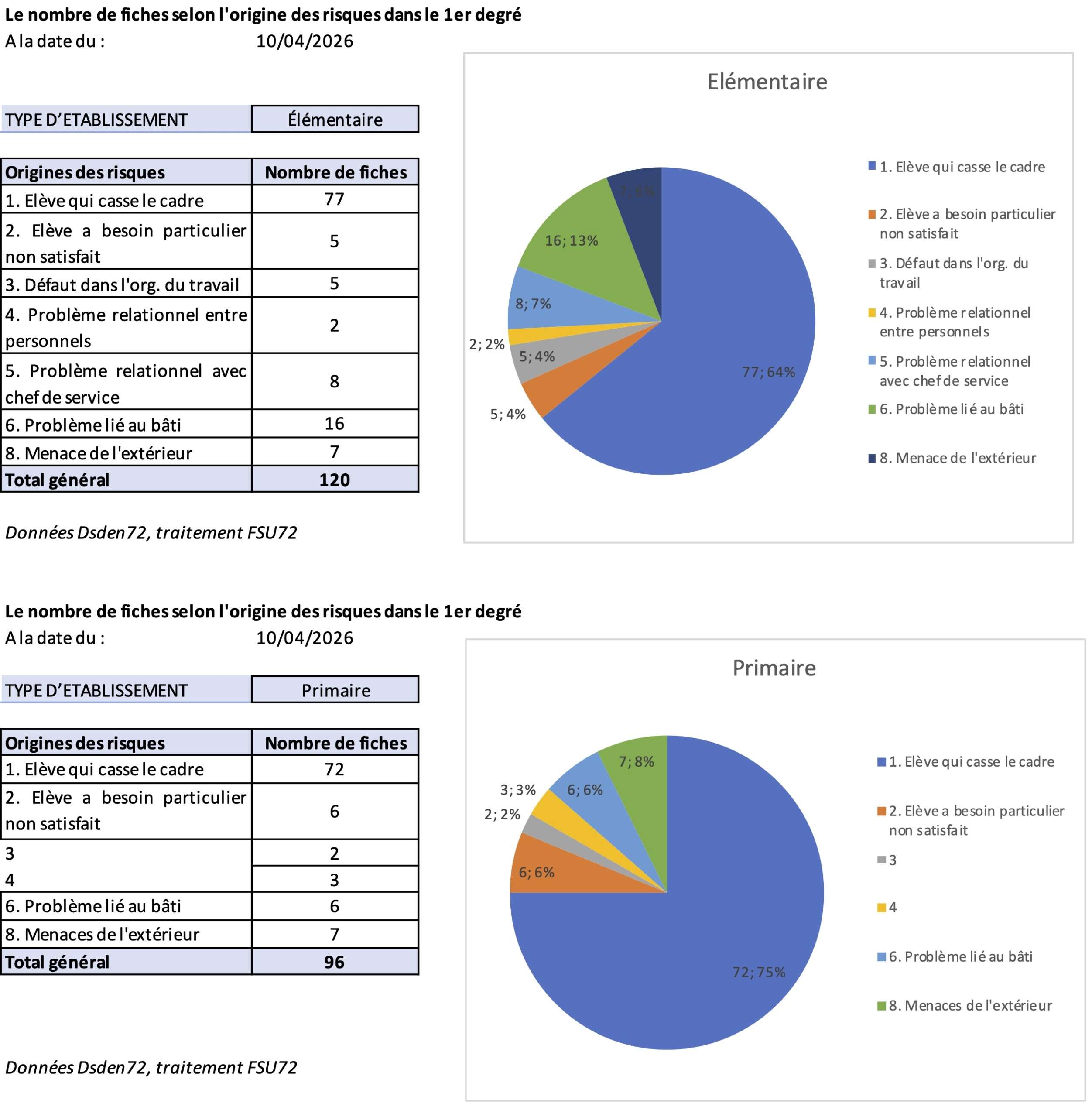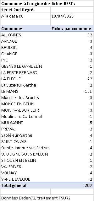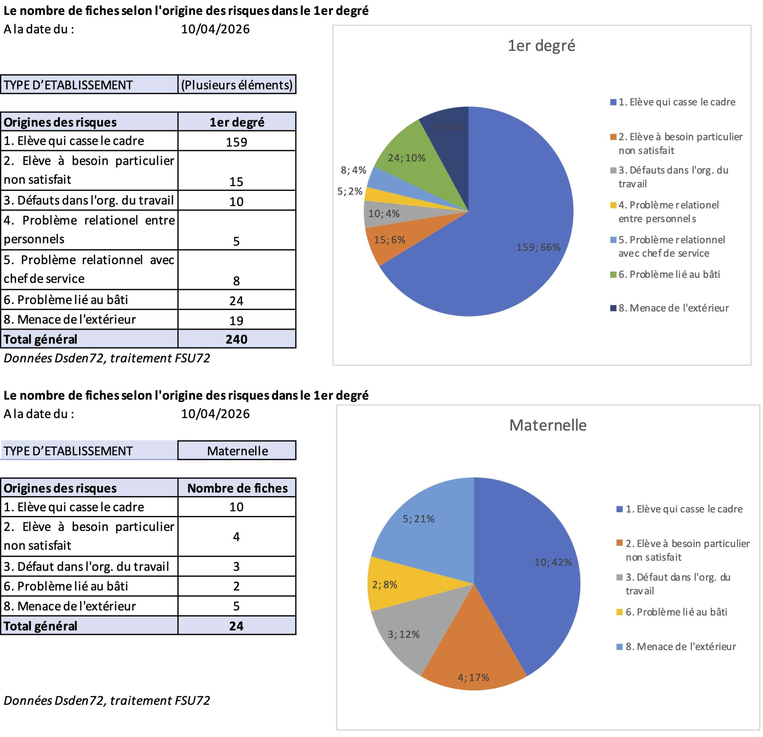 Les données issues des fiches du registre santé et sécurité au travail (RSST) de la DSDEN 72, traitées par la FSU 72 au 10 avril 2026, mettent en lumière une forte concentration des alertes dans le premier degré, avec une prédominance de situations liées aux élèves et à la dégradation du cadre de travail. Elles permettent d’objectiver la cartographie des risques (physiques, psychosociaux et de sécurité) ainsi que leur répartition territoriale au sein du département.