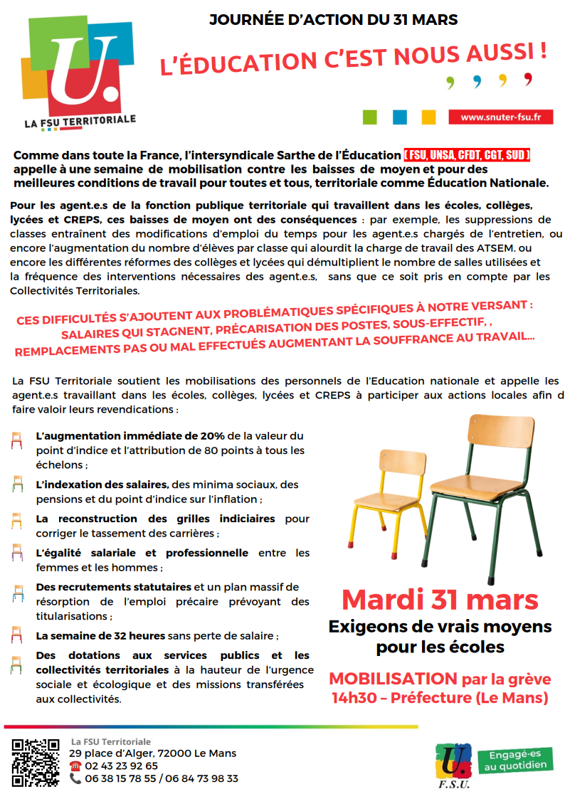 C’est pour cela que l’intersyndicale de l’éducation en Sarthe (FSU, UNSA, CFDT, CGT et SUD) appelle à une journée de grève et de mobilisation, le mardi 31 mars.